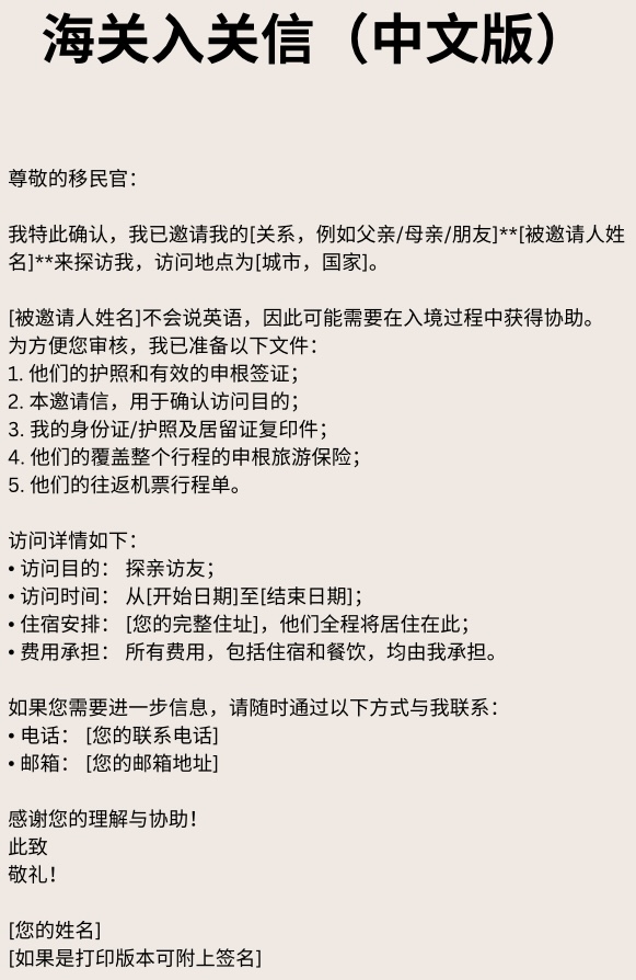 • 由邀请人出具,说明访问目的、关系、居住安排等,图2:英文模版, 图3:中文模版